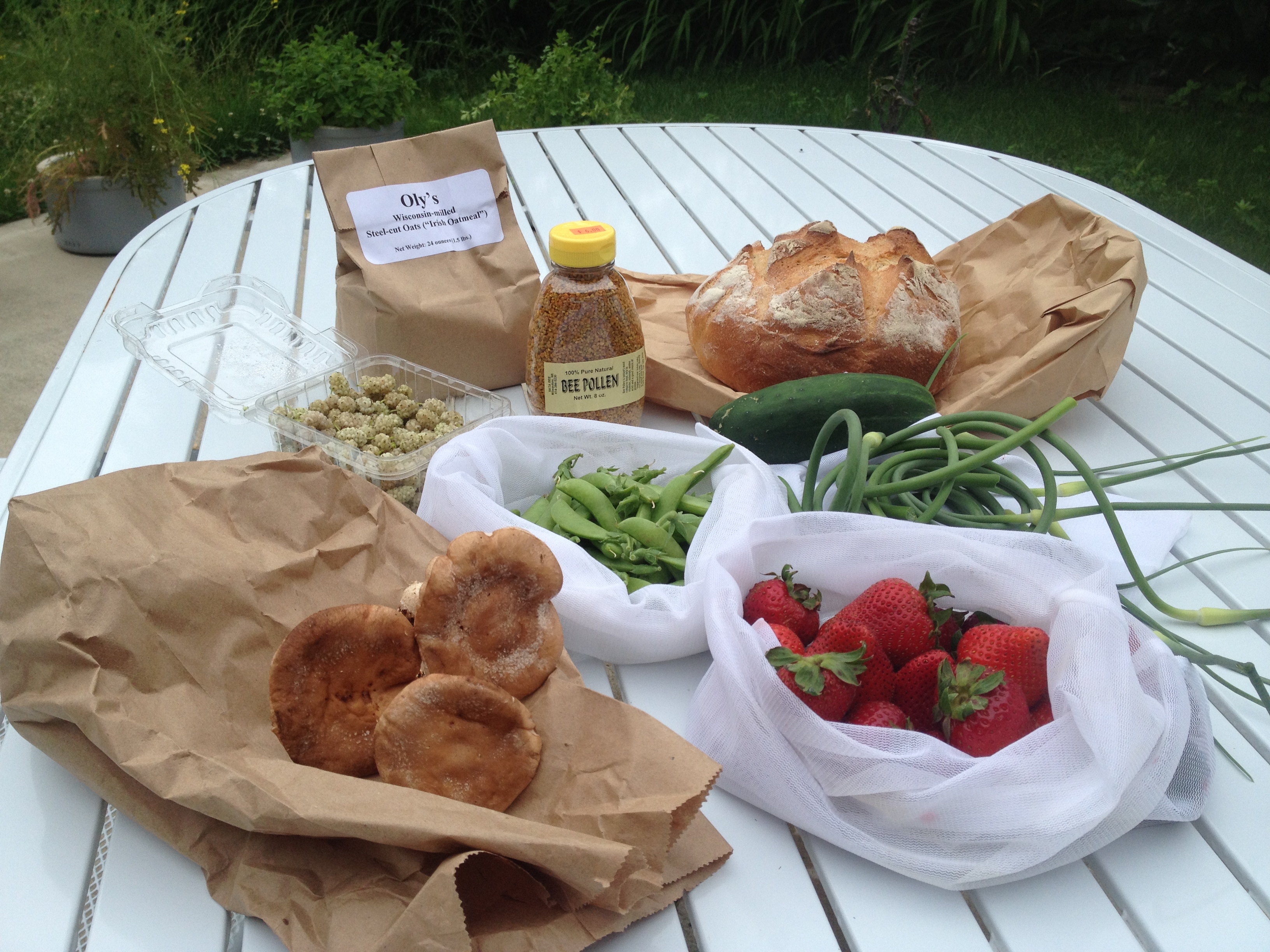 The farmers were all in good spirits as we picked up shiitake mushrooms, strawberries, garlic scapes and a loaf of pane rustico bread. We got into a great conversation with the lovely April from LOTFOTL (acronym for Living Off The Fat of the Land) and purchased sugar snap peas, a cucumber, and WHITE MULBERRIES!!! We were particularly admiring their signs, the QR codes lead you directly to the LOTFOTL blog with recipes.