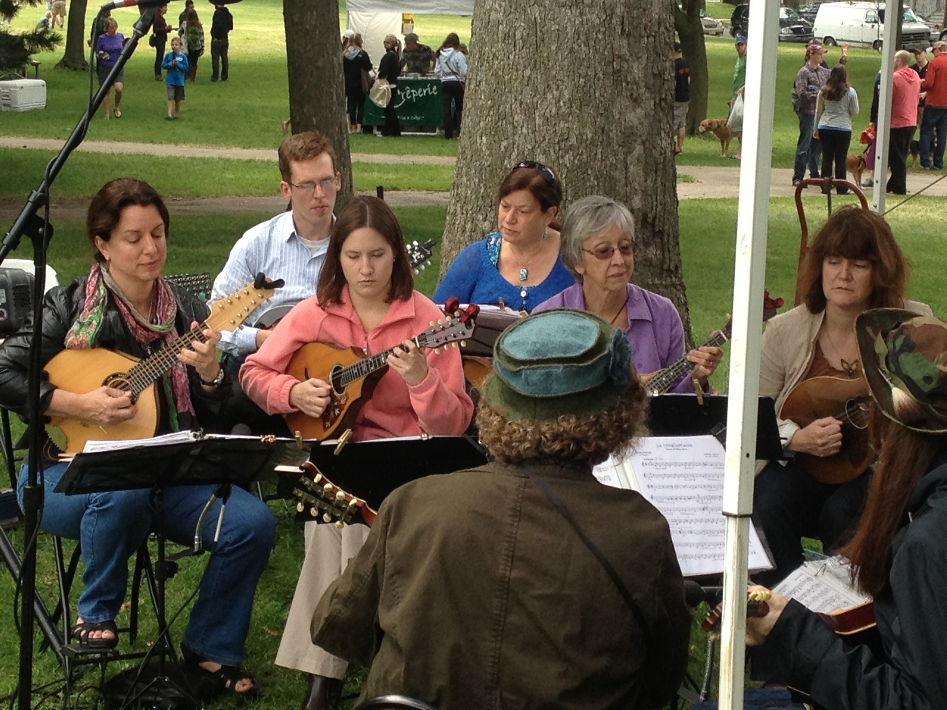 The day was warm, and I was exhausted. I’d flown back from Maine the night before after what can only be described as a two week art bender at Haystack, where my finest culinary experience was eating fresh lobsters on the rocks with seals swimming by, but I digress. I’m pretty sure we ate ALL the breakfast sandwiches available at the market, drank iced coffee and juice, and collapsed onto the grass, too exhausted to make the extensive 1 mile journey home until the food I’d just consumed provided nourishment. Usually, we get to the market right at 8am, buy our produce and are out of there by 9:30 or 10. Good for taking care of business (TCB) but bad for watching the entertainment. I am SO GLAD we didn’t miss it this time because the Milwaukee Mandolin Orchestra (their performance name) was truly fantastic.